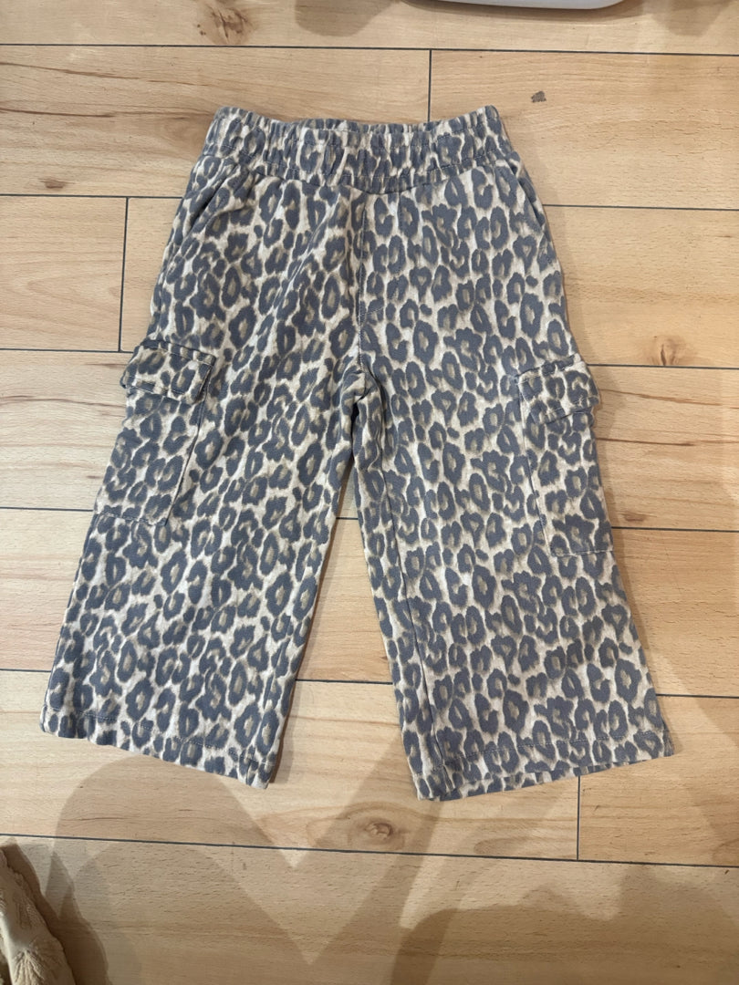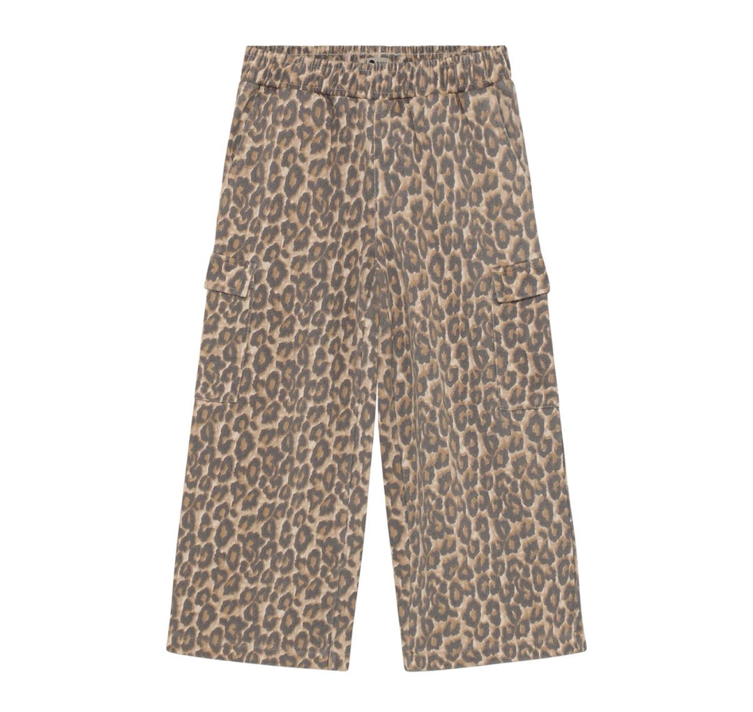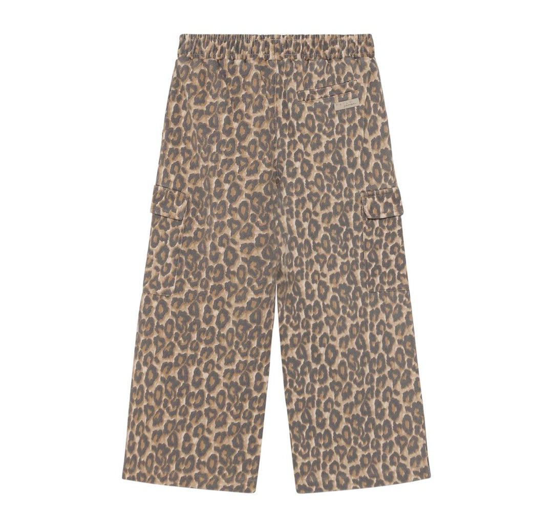 Roam free in these wide cargo pants in soft Sandshell, with a bold leopard print, side pockets and leg pockets for little treasures.